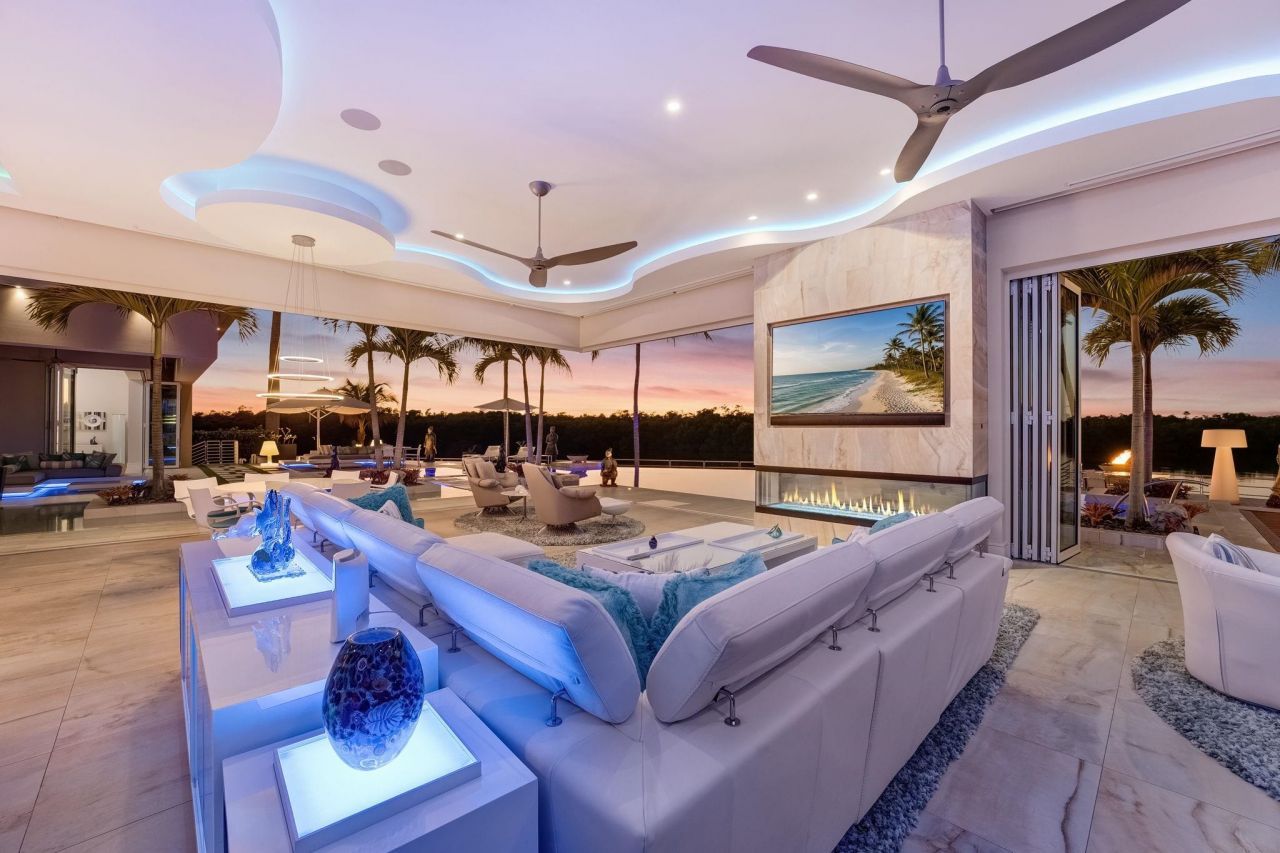 Welcome to one of Fort Myers' most striking contemporary waterfront estates - where bold architecture meets a true yachter's lifestyle. Set on nearly half an acre, this extraordinary residence spans approximately 14,000 total square feet (with 6,200 square feet under air) and is curated with uncompromising finishes, including Italian porcelain flooring throughout and custom Poggenpohl cabinetry seamlessly carried across the home. Adding an elevated designer touch, Lalique glass fixtures are feat...Welcome to one of Fort Myers' most striking contemporary waterfront estates - where bold architecture meets a true yachter's lifestyle. Set on nearly half an acre, this extraordinary residence spans approximately 14,000 total square feet (with 6,200 square feet under air) and is curated with uncompromising finishes, including Italian porcelain flooring throughout and custom Poggenpohl cabinetry seamlessly carried across the home. Adding an elevated designer touch, Lalique glass fixtures are featured throughout, bringing artful elegance to every space.A 271-foot wrap-around dock with two floating docks, a 40,000 pound boat lift, room for an 80 foot yacht, and direct Gulf access places you in a boater's dream setting - tucked within a private, quiet idle-speed zone for calm waters and effortless departures. Outside, the estate transforms into a resort-style retreat with a mega entertainment deck, expansive outdoor living areas, and dramatic accordion impact-glass doors that open wide to fully embrace true indoor-outdoor living. Enjoy a showstopping zero-edge pool and spa, a dedicated party room, and an incredible award winning Crestron sound and lighting system that makes entertaining (and everyday living) seamless.Inside, the home is inspired by contemporary design at its finest - featuring 20-foot soaring ceilings, luminous open living spaces, and refined architectural details throughout. The chef's kitchen is a statement in both style and performance with high-end Miele appliances, quartz countertops, and added convenience like instant hot and cold water. A striking glass wine room and a custom bar area, complete with an al fresco gas grill, set the stage for unforgettable gatherings.The layout is thoughtfully arranged for privacy: the primary suite, flex room, and gallery occupy the west wing, while guest accommodations are positioned in the east. The primary bath feels like a private spa, featuring a large soaking tub, walk-in shower, heated towel rack, and a TV built into the mirror for the ultimate in luxury and comfort.Completing the experience is a rare 5-car garage, offering ample space for vehicles, toys, and storage. Perfectly positioned near everything that matters - approximately 15 minutes to the private airport, 20 minutes to the international airport, and close to fine dining, shopping, and area beaches - this is not just a home, it's a destination.