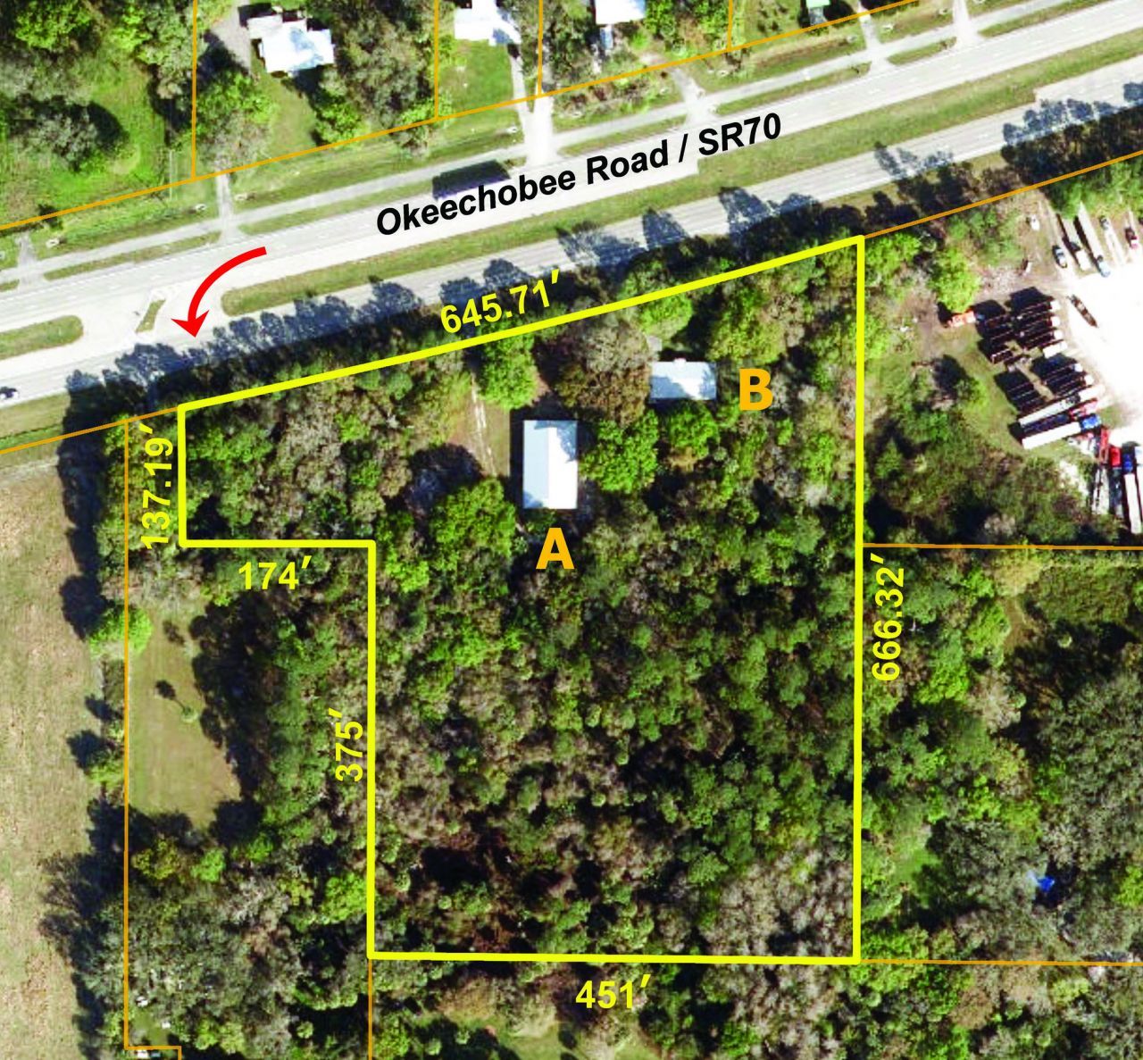 Home or Office plus versatile Shop building on wooded acreage. Mid-century CBS 3BR home with beautiful wood floors and large deck overlooking shaded yard of virgin oaks and pines. 3,344sf CBS Shop has four 18ft wide X 10ft high roll doors and 2,000sf concrete apron. Both have metal roofs. 3 driveways onto SR70 provide quick easy access to both I-95 & Turnpike. ~ Please see our BROCHURE for additional details ~