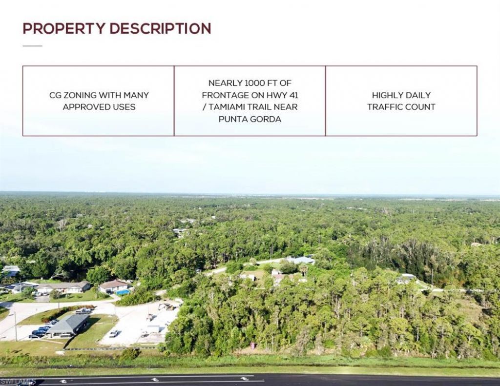 Large Lot totaling 4.78 Acres with access from 3 sides and a Lot totaling 2.03 Acres on Highway 41/Tamiami Trail in Punta Gorda near Tuckers Grade. See attached Survey and uses for Commercial General zoning. This land is in low-risk flood zone D. This is going to be a growing area over the next 5 years. Tucker’s Pointe Development is a large Residential 1600 units development currently being built by national developers such as Toll Brothers and Lennar. The project is part of a...Large Lot totaling 4.78 Acres with access from 3 sides and a Lot totaling 2.03 Acres on Highway 41/Tamiami Trail in Punta Gorda near Tuckers Grade. See attached Survey and uses for Commercial General zoning. This land is in low-risk flood zone D. This is going to be a growing area over the next 5 years. Tucker’s Pointe Development is a large Residential 1600 units development currently being built by national developers such as Toll Brothers and Lennar. The project is part of a larger 564-acre residential and commercial development that includes land preservation within Tuckers Grade, U.S. 41 and Interstate 75. Fantastic Develop Opportunity in a growing area of Florida. Commercial General Zoning allows for many uses. Punta Gorda Airport is only a few miles away. All surrounding areas are experiencing business and residential growth. Land on Tamiami Trail will continue to increase in value quickly over the next few years. Easy access from I75 off Tuckers Grade to Tamiami Trail (HYW 41) High Traffic counts on HYW 41/Tamiami Trail. Over 1000 feet of frontage on HYW 41/Tamiami Trail between both lots. See attached survey. Developers and Investors opportunity to build cash flowing buildings. Great opportunity and Solid investment for an end user to pick up land, develop and be ahead of the game in this now growing area of Florida. Traffic from North Fort Myers, Cape Coral, Punta Gorda and Port Charlotte all pass through this area on a regular basis. Charlotte County has recently purchased substantial land just up the road to build water treatment plant, utilities, Fire Station and more. Several new construction commercial & residential communities are to be announced soon. Anchor Companies like Walmart, Aldi, Home Depot and more have moved into the area. One exit from the Punta Gorda airport which is growing quickly. Great location for Retail, Hybrid Flex, Service Companies and more. See attached approved uses under the CG zoning. Feel free to reach out for the full offering memorandum