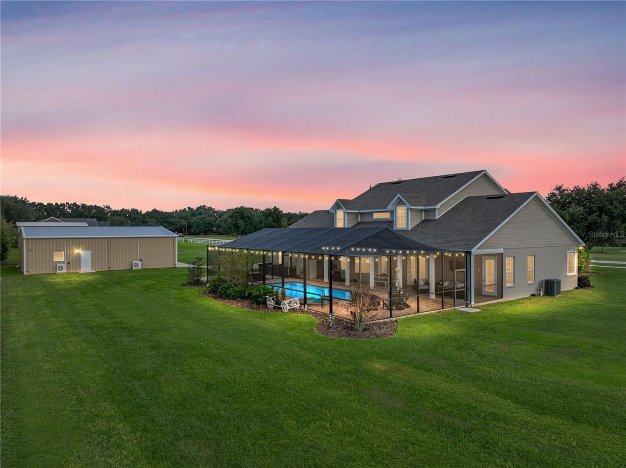 Welcome to a truly rare opportunity in Central Florida - a stunning estate offering over 4,100 square feet of beautifully designed living space, nestled on a private 2.46-acre homesite with no HOA. This impressive two-story residence blends comfort, function, and Florida luxury with a sprawling screened-in pool area, complete with a hot tub, outdoor kitchen, and fire pit zone that's perfect for entertaining year-round. Inside, you'll find 4 spacious bedrooms, 3.5 bathrooms, and a layout that fee...Welcome to a truly rare opportunity in Central Florida - a stunning estate offering over 4,100 square feet of beautifully designed living space, nestled on a private 2.46-acre homesite with no HOA. This impressive two-story residence blends comfort, function, and Florida luxury with a sprawling screened-in pool area, complete with a hot tub, outdoor kitchen, and fire pit zone that's perfect for entertaining year-round. Inside, you'll find 4 spacious bedrooms, 3.5 bathrooms, and a layout that feels open yet intimate. The downstairs primary suite is a true retreat featuring dual vanities, two walk-in closets, a garden tub, and a walk-in shower. Plantation shutters grace the main floor, while the heart of the home features soaring ceilings and French doors leading to the pool. A large open office and formal dining room with custom built-ins provide elegance and versatility, while the upstairs offers three bedrooms, two full baths, and a massive bonus room and loft-style living space that is as functional as it is unique.But the showstopper? A detached 50x40 insulated metal building outfitted with two oversized garage doors, two mini split AC systems, and enough space to store your boats, toys, or even operate a home-based business. The oversized 3-car attached garage offers a flexible setup with a divided bay ideal for a gym or golf cart parking. Topped with a brand new roof (2025), this estate is the perfect blend of luxury living and practical functionality - and all just minutes from I-4, downtown Auburndale, and Central Florida's attractions.