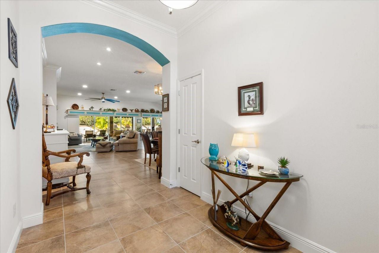 Rare privacy and a Florida coastal feel in the Village of Collier, conveniently located near Brownwood. This stretched Lantana offers no rear neighbors, with privacy screening that limits visibility from adjacent homes, creating a secluded outdoor setting. Situated on approximately .30 acres, the property includes open green space beyond the pool, enhancing privacy and outdoor use. The expanded lanai is designed for both relaxation and entertaining, featuring a screened enclosure with porcelain ...Rare privacy and a Florida coastal feel in the Village of Collier, conveniently located near Brownwood. This stretched Lantana offers no rear neighbors, with privacy screening that limits visibility from adjacent homes, creating a secluded outdoor setting. Situated on approximately .30 acres, the property includes open green space beyond the pool, enhancing privacy and outdoor use. The expanded lanai is designed for both relaxation and entertaining, featuring a screened enclosure with porcelain tile flooring, retractable solar screens, leaf filters on gutters, and a beach-style bar and barbecue area. The designer pool includes a waterfall, solar heat, and app-based controls. A three-person hot tub is privately accessible from the primary bedroom, and decorative birdcage panels add additional privacy. Enjoy Fourth of July fireworks from the Wildwood area from your own pool deck, without leaving home. Inside, the home features thoughtful upgrades and a distinctive design. The expanded and remodeled kitchen includes granite countertops, a copper range hood and sink, along with a built-in wine refrigerator. Crown molding is featured throughout the home, complemented by upgraded ceiling fans, lighting fixtures, and solar tubes. Automated shades are installed on the slider doors in the living area. The primary suite offers lanai access, automatic blackout shades, a walk-in Roman shower, soaking tub, and bidet. Plantation shutters are installed in the front guest bedroom. All windows are equipped with breakage film, with additional solar film applied to select windows. Additional features include a two-car garage plus two golf cart bays, a remote-controlled golf cart screen, and a large attic over the garage for storage. The home includes automated systems for climate control (Ecobee), irrigation (Hydrawise), and pool operation (OmniLogic). Exterior security cameras are installed; monitoring service is optional.