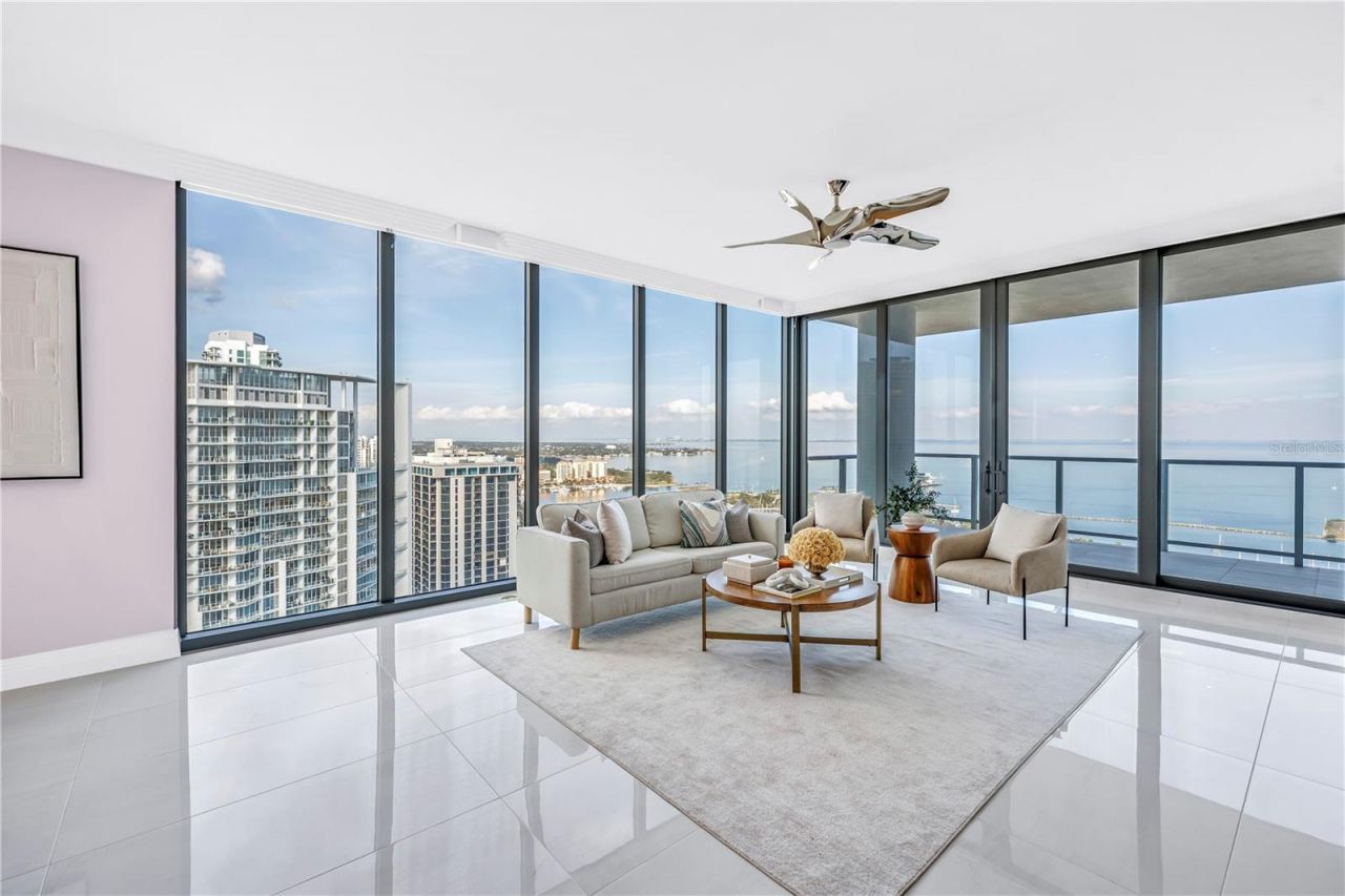 This 3 bedroom, 4 full bath, 2712 SF Azure unit at Saltaire features custom and luxurious upgrades with floor to ceiling, unobstructed views from the NE corner of St. Petersburg's premier luxury condo building. Step into a bright entry & open living room, with high ceilings, recessed LED lighting, & gorgeous large format porcelain tile floors. Follow the light into the custom chef's kitchen, thoughtfully redesigned by Michael Bright of Bright Wood Works, in coordination w/ Exceptional Granite Ti...This 3 bedroom, 4 full bath, 2712 SF Azure unit at Saltaire features custom and luxurious upgrades with floor to ceiling, unobstructed views from the NE corner of St. Petersburg's premier luxury condo building. Step into a bright entry & open living room, with high ceilings, recessed LED lighting, & gorgeous large format porcelain tile floors. Follow the light into the custom chef's kitchen, thoughtfully redesigned by Michael Bright of Bright Wood Works, in coordination w/ Exceptional Granite Tile and Marble. The original island was made wider to accommodate more storage, & is covered with a waterfall edge Pompeii Greylac Book Match quartz that effortlessly transitions to the adjacent countertops & backsplash. A Jenn-Air fridge was custom outfitted to blend in with the cabinetry, & top of the line Miele cook top, microwave, oven, dishwasher, & coffee maker are just a few upgrades. Custom details like hidden outlets & charging stations, hydraulic openers on upper cabinetry, specialty trash opener, paper towel dispenser, Franke sink, & more make this kitchen an entertainer's dream! For ultimate entertaining, the kitchen is open to expansive dining space, featuring a custom tray ceiling with changeable LED lighting to highlight the most spectacular of chandeliers. Bright Wood Works also designed a fabulous wet bar, complete with lighted displays, Sub-Zero wine cooler, beverage refrigerator & ice maker, & more hidden storage for all your party supplies. The kitchen, dining room, & family room are one expansive, light filled space with floor to ceiling impact windows, automated roll down shades from the Blind & Shutter Gallery, custom built-in home theater featuring a 78 Sony TV w/ Definitive Technology towers & Denon surround sound, lighted display case, & sliding doors that open to a large outside covered balcony. From your living space & master bedroom, you have spectacular views of Tampa Bay, Albert Whitted Airport, multiple yacht basins, the Pier & Downtown St. Petersburg. Continue through the family room to your master suite, w/ floor to ceiling windows, automated roll down shades, custom crown molding, Artemis lighted ceiling fan, two walk in closets customized by Closets By Design, & a gorgeous master bath re-imagined by Michael Bright. Custom floating double vanity features lighting above & below, w/ extra storage & custom under mount porcelain sinks. Toilet closet features frosted glass enclosure hiding a top of the line Toto toilet, & generous glassed walk in shower features a built in bench & soap niche. The Azure plan features a split bedrooms, so your guests can enjoy private guest rooms off the living room. Two guest bedrooms feature high ceilings, Artemis lighted ceiling fans, walk in closets customized by Closets By Design, & en-suite bathrooms w/ custom vanities, porcelain under mount sinks, Toto toilets, & walk in showers. There is a large laundry room w/ Whirlpool washer & dryer, utility sink, & extra wine cooler. A fourth full bathroom is in the hallway for convenience, w/ Toto toilet & shower that has been converted to a storage closet. This unit also has a deeded storage unit in the common area hallway, & two deeded parking spots together on the 3rd Parking Floor. Saltaire is a fabulous building w/ covered drive in entry, grand lobby with 24 hour concierge, resort style pool and spa, cozy cabanas, social & club rooms, fitness center, dog run, and more. Make your private appointment today!