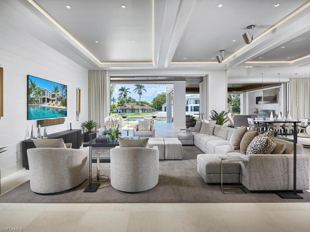 London Bay redefines luxury and encapsulates the essence of Naples’ exclusive Port Royal lifestyle in this stunning waterfront estate, which boasts 107 feet of Hidden Bay shoreline and direct access to the Gulf of Mexico. The estate’s architecture, designed by the acclaimed Kukk Architecture & Design, makes a bold statement and includes all the necessary amenities for stylish entertaining. Interior design, furnishings, finishes, and custom selections by Romanza Interior Design crea...London Bay redefines luxury and encapsulates the essence of Naples’ exclusive Port Royal lifestyle in this stunning waterfront estate, which boasts 107 feet of Hidden Bay shoreline and direct access to the Gulf of Mexico. The estate’s architecture, designed by the acclaimed Kukk Architecture & Design, makes a bold statement and includes all the necessary amenities for stylish entertaining. Interior design, furnishings, finishes, and custom selections by Romanza Interior Design create a unique palette that balances elegance and effortless living. The soft contemporary aesthetic features limestone floors in the main living areas and pewter white oak wood flooring in the primary suite, study, and throughout the second floor. The open floor plan captivates with expansive living spaces, all offering beautiful bay views. Pocketing Weiland lift-and-slide doors seamlessly extend the spacious great room, kitchen, and dining area to both covered and open-air alfresco living spaces with uninterrupted flush flooring. The kitchen is tailored with Poliform cabinetry and an oversized island, a Galley workstation sink, and a built-in table for casual dining. The elegant primary suite includes an impressive gallery and a boutique-style oversized Poliform walk-in closet with custom Casali doors. Featuring luxurious dual baths connected by a shared shower, this light-filled suite boasts walls and ceilings adorned with Venetian plaster and floor-to-ceiling glass leads to a tranquil outdoor retreat. The second floor offers a VIP suite and three spacious en-suite guest rooms, as well as a dedicated exercise studio and a second laundry room that encircle a well-appointed loft. The loft features a morning kitchen and sliding glass doors that open to a bay-facing balcony. The covered lanai provides outdoor living, dining, and a large well-equipped kitchen for entertaining. Water cascades from the raised spa into the infinity edge pool’s sun shelf, which is connected by stepping stones leading to a sunning deck and a secluded lounge with a fire table. The estate also includes the conveniences of an air-conditioned three-car garage, elevator, and a generator. Eligible for Port Royal membership.