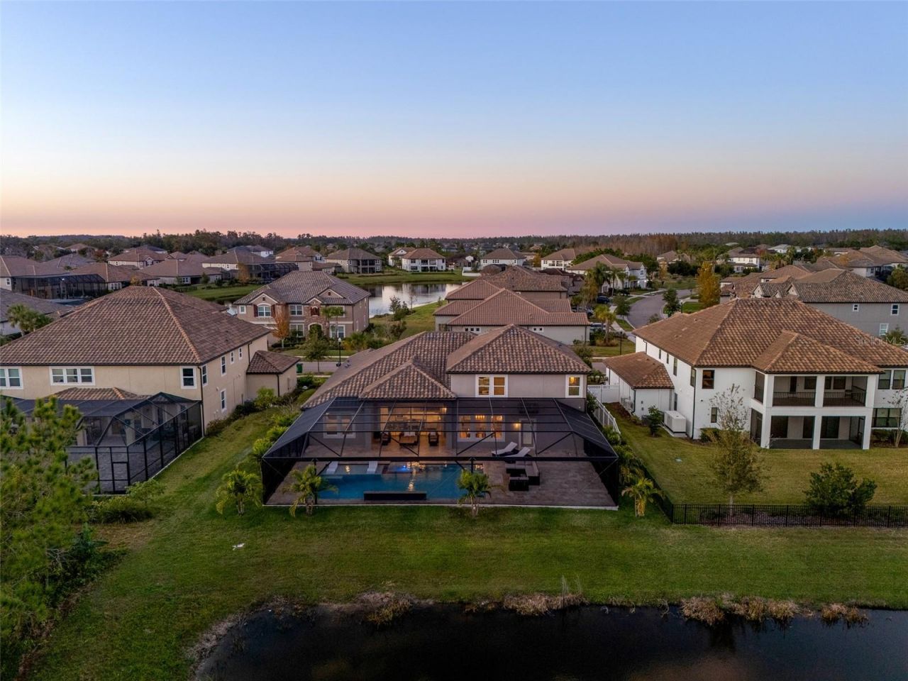 Introducing an exquisite five-bedroom, 4.5-bath estate with private pool in the exclusive, gated Graybrook section of Watergrass in Wesley Chapel. Inside, you are greeted by polished marble tile floors, custom accent walls, tray ceilings with accent lighting, and matching crystal hanging light fixtures that set a tone of sophisticated elegance throughout the formal living and dining areas. The heart of the home is the gourmet kitchen, showcasing GE appliances, built-in dual ovens, a ceramic cook...Introducing an exquisite five-bedroom, 4.5-bath estate with private pool in the exclusive, gated Graybrook section of Watergrass in Wesley Chapel. Inside, you are greeted by polished marble tile floors, custom accent walls, tray ceilings with accent lighting, and matching crystal hanging light fixtures that set a tone of sophisticated elegance throughout the formal living and dining areas. The heart of the home is the gourmet kitchen, showcasing GE appliances, built-in dual ovens, a ceramic cooktop with range hood, a built-in microwave and a convenient coffee bar. The kitchen creates a culinary haven with a built-out pantry, under-cabinet lighting and a striking large-format granite backsplash. The adjacent living room centers around a stunning backlit porcelain tile feature wall, complemented by crown molding and well-appointed trim work throughout the home. Retreat to the luxurious primary suite, which features a built-in electric fireplace, pocket windows with electric shades, and generous sized windows facing the lanai overlooking the pool and tranquil pond. The spa-inspired primary bath offers a frameless glass walk-in shower lined with marble tile, a separate deep soaking tub, a private water closet with a marble feature wall, and dual walk-in closets with built-out shelving. Upstairs, the loft space serves as the ultimate entertainment hub, complete with a wet bar, a tasteful feature wall and built-in 185-inch backlit projector wall. Seamless indoor-outdoor living is achieved through 8-foot sliding glass doors and overhead transom windows that flood the living area with natural light. Go out to the panoramic screened-in travertine lanai and experience an elevated sense of privacy courtesy of no rear neighbors, and surrounded by lush palm trees, where you can enjoy the heated saltwater pool, with a tanning ledge and bubbler jets, sunken hot tub and tile waterfall feature. Additional functional highlights include a paver driveway, covered entryway, mudroom with drop zone organizer, three-car garage, canvas hurricane shutters, irrigation system and rain gutters, ensuring this home is as practical as it is beautiful. In the planned community of Watergrass, offering ample community amenities in the form of multiple community pools and playgrounds, Watergrass Elementary and fire department, along with an adjacent new Publix and Starbucks. With nearby interstate access, this growing area is home to sought-after Innovation Preparatory Academy and The Kirkland Ranch Academy of Innovation schools, while close to hospitals, dining, shopping, The Tampa Premium Outlets, KRATE at The Grove of Wesley Chapel and Shops at Wiregrass.