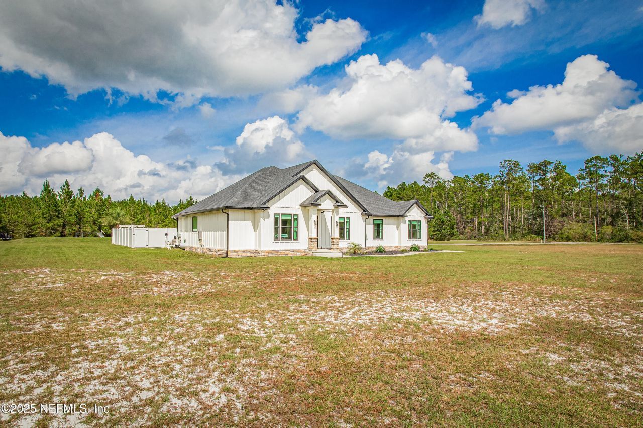 Luxury Home with Pool on Over 4 Acres | Custom-Built Retreat Just 4 Years Old. Welcome to your private retreat-this stunning custom-built luxury home with a pool sits on over 4 acres and offers timeless craftsmanship, upscale finishes, and a serene setting just minutes from Jacksonville, Amelia Island, and I-95. Only four years old and meticulously maintained, this four-bedroom, three-bathroom residence feels like new. Step inside to soaring vaulted ceilings with exposed wood beams, a cozy gas f...Luxury Home with Pool on Over 4 Acres | Custom-Built Retreat Just 4 Years Old. Welcome to your private retreat-this stunning custom-built luxury home with a pool sits on over 4 acres and offers timeless craftsmanship, upscale finishes, and a serene setting just minutes from Jacksonville, Amelia Island, and I-95. Only four years old and meticulously maintained, this four-bedroom, three-bathroom residence feels like new. Step inside to soaring vaulted ceilings with exposed wood beams, a cozy gas fireplace, and wide-open living spaces adorned with luxury vinyl plank flooring throughout. The chef's kitchen is a showstopper, featuring stainless steel appliances, a large walk-in pantry, and custom cabinetry designed for both style and function. The home's split floor plan offers privacy for each bedroom, all of which include walk-in closets. The elegant primary suite features a spa-inspired bathroom with dual walk-in closets, a soaking tub, and an oversized walk-in shower.