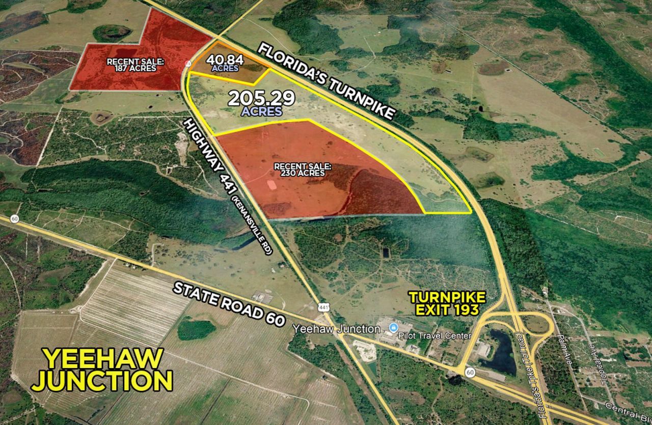This expansive 40.84-acre property in Okeechobee is located at the Florida Turnpike/State Road 60 exit at Yeehaw Junction - only 30 minutes from Vero Beach and central to all major Florida markets. Currently zoned RMH residential with almost 6 acres of the property approved for commercial future land use. In addition to potential residential development, this property is in a prime location for various industrial and commercial uses such as distribution centers or mixed use. Features 1700 feet ...This expansive 40.84-acre property in Okeechobee is located at the Florida Turnpike/State Road 60 exit at Yeehaw Junction - only 30 minutes from Vero Beach and central to all major Florida markets. Currently zoned RMH residential with almost 6 acres of the property approved for commercial future land use. In addition to potential residential development, this property is in a prime location for various industrial and commercial uses such as distribution centers or mixed use. Features 1700 feet of frontage on the Turnpike with an income-generating billboard and 1700 feet of frontage on US 441/Kenansville Rd. Owned by the same family for over 50 years. The adjacent 205+ acre property is also available for purchase for a potential of 246+ acres combined.