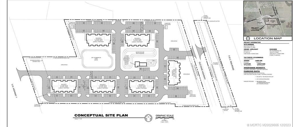 9.8 acres zoned CG w public water and sanitary sewer w 266' on US 1 and 505' on Old Dixie Hwy. Several concept plans w preliminary approval for 147 apartments PUD, 94 townhouses PUD, above ground RV and Boat Storage, Commercial, shopping center.