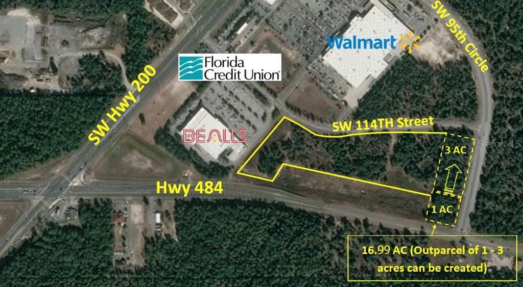 16.99 ac, outparcel of 1-3 acres can be created. Property is Zoned B4, and the Marion County Parcel ID is 35341-001-19. Hwy 484 and SW Hwy 200 combined traffic count is 27,800 cars each day (FDOT 2022). Property is adjacent to Walmart and Bealls. Seller Financing available.