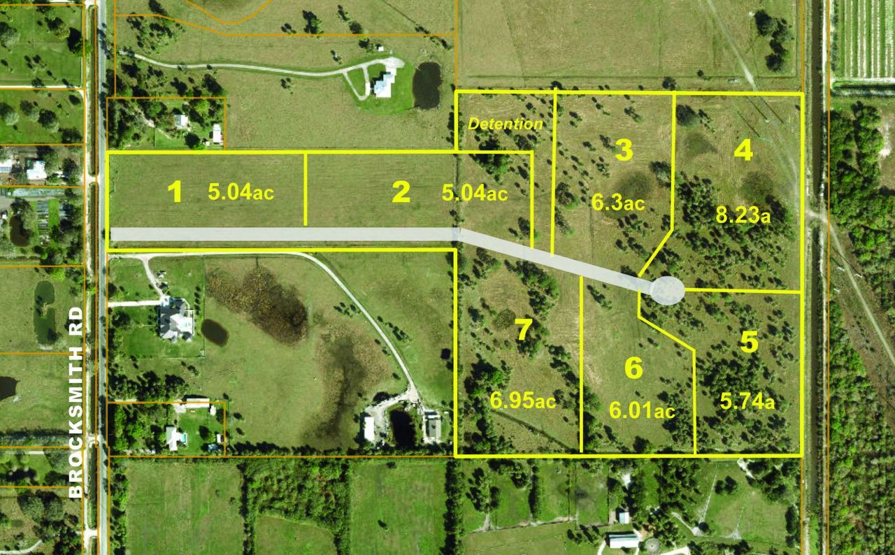 This Fully Approved 7-Lot Subdivision is located in an area of equestrian homesites and ranchettes. Its 5ac to 8ac lots are similar in size to surrounding developed parcels. Site would also make an excellent Estate Homesite for a discriminating buyer seeking privacy. Oaks, Sabal Palms & Pines dot the majority of the property.Brocksmith Road is locally considered very desirable because of its well-kept properties, larger parcels offering privacy, and close proximity to I-95 & FL Turnpike withou...This Fully Approved 7-Lot Subdivision is located in an area of equestrian homesites and ranchettes. Its 5ac to 8ac lots are similar in size to surrounding developed parcels. Site would also make an excellent Estate Homesite for a discriminating buyer seeking privacy. Oaks, Sabal Palms & Pines dot the majority of the property.Brocksmith Road is locally considered very desirable because of its well-kept properties, larger parcels offering privacy, and close proximity to I-95 & FL Turnpike without heavy local traffic. Fort Pierce offers a vibrant downtown waterfront area with boutique shopping and numerous restaurants. There are several marinas, an excellent ocean inlet and outstanding inshore and offshore fishing opportunities.